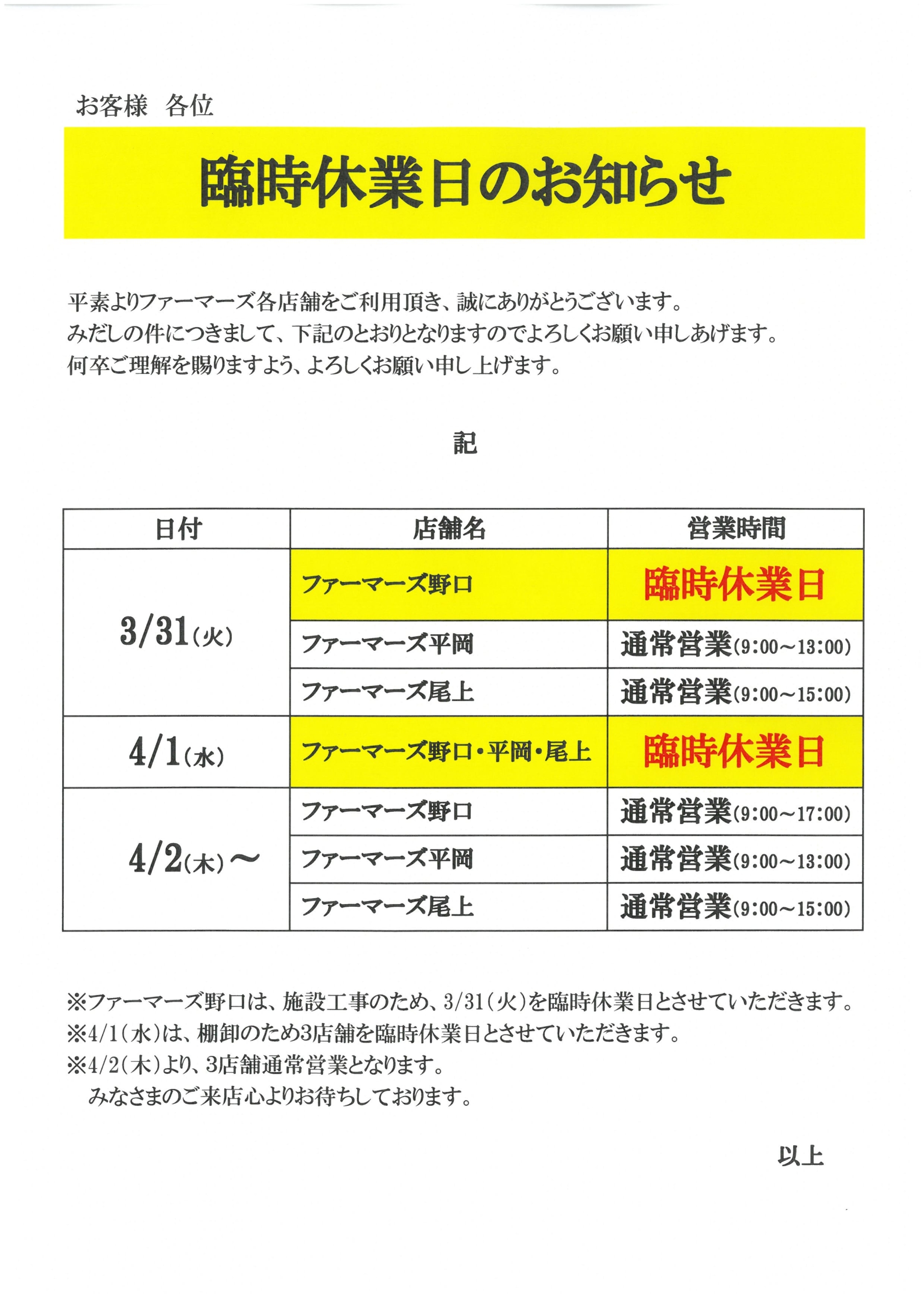 ファーマーズ店舗の臨時休業のご案内
