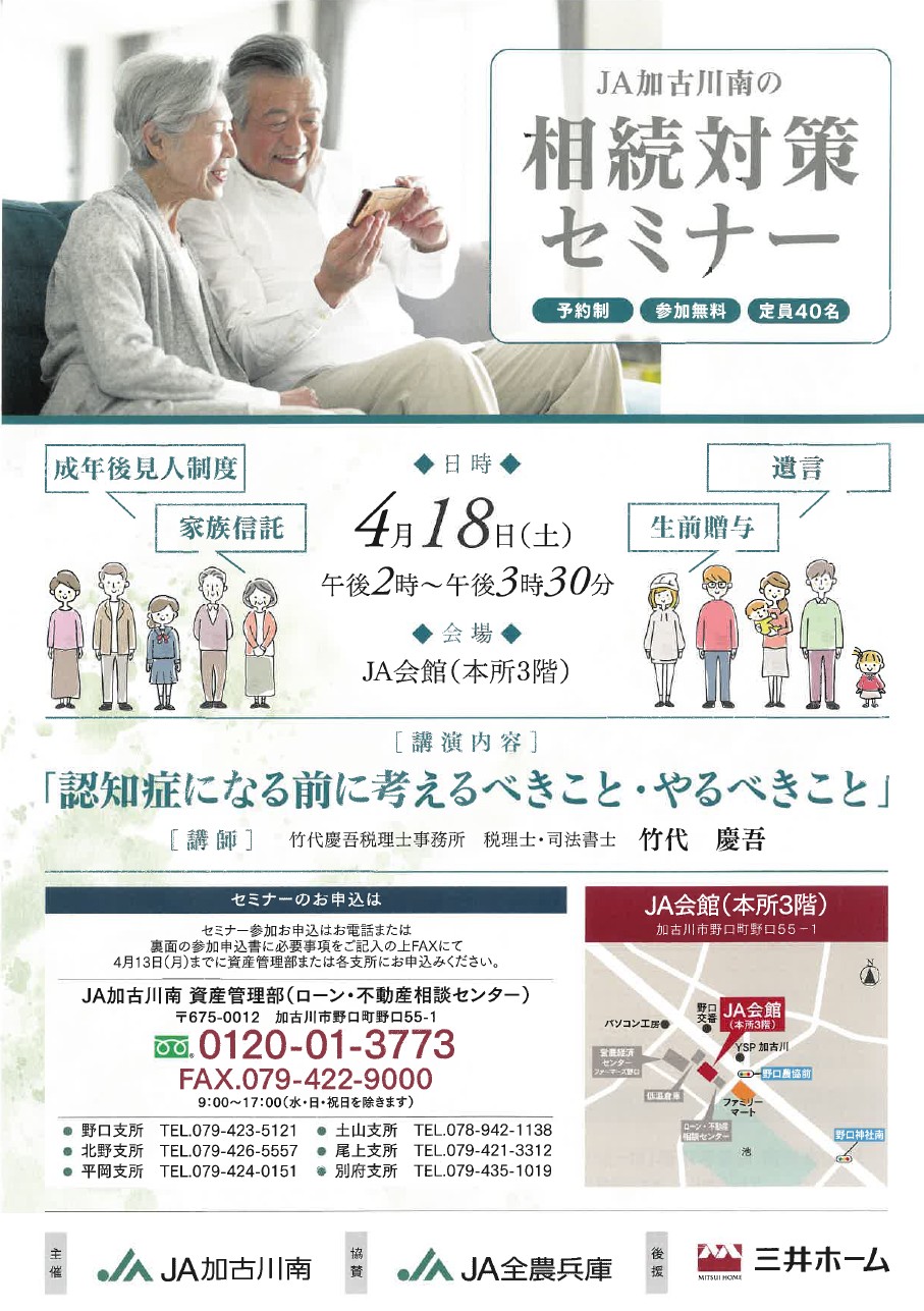 この度、JA加古川南 資産管理部では、税理士を招いて「相続対策セミナー」を開催いたします。
