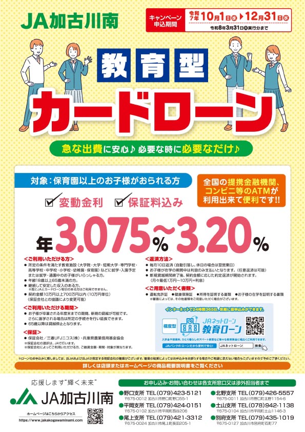 いざという時の出費も安心!カードローン型教育ローン受付中!