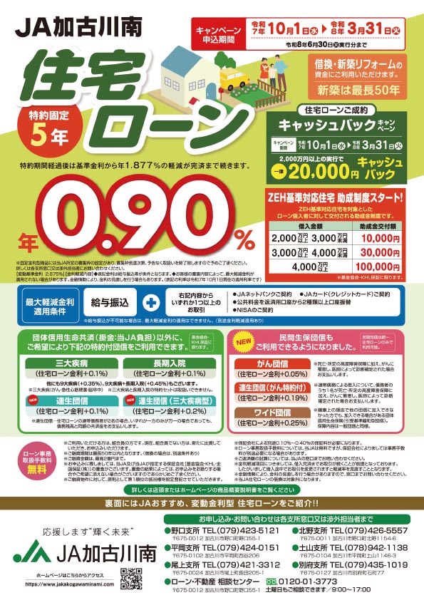 また、変動金利型の住宅ローンの取扱いもございます。最大軽減金利0.875%にてお取り扱いしております。ぜひこの機会にご検討ください。