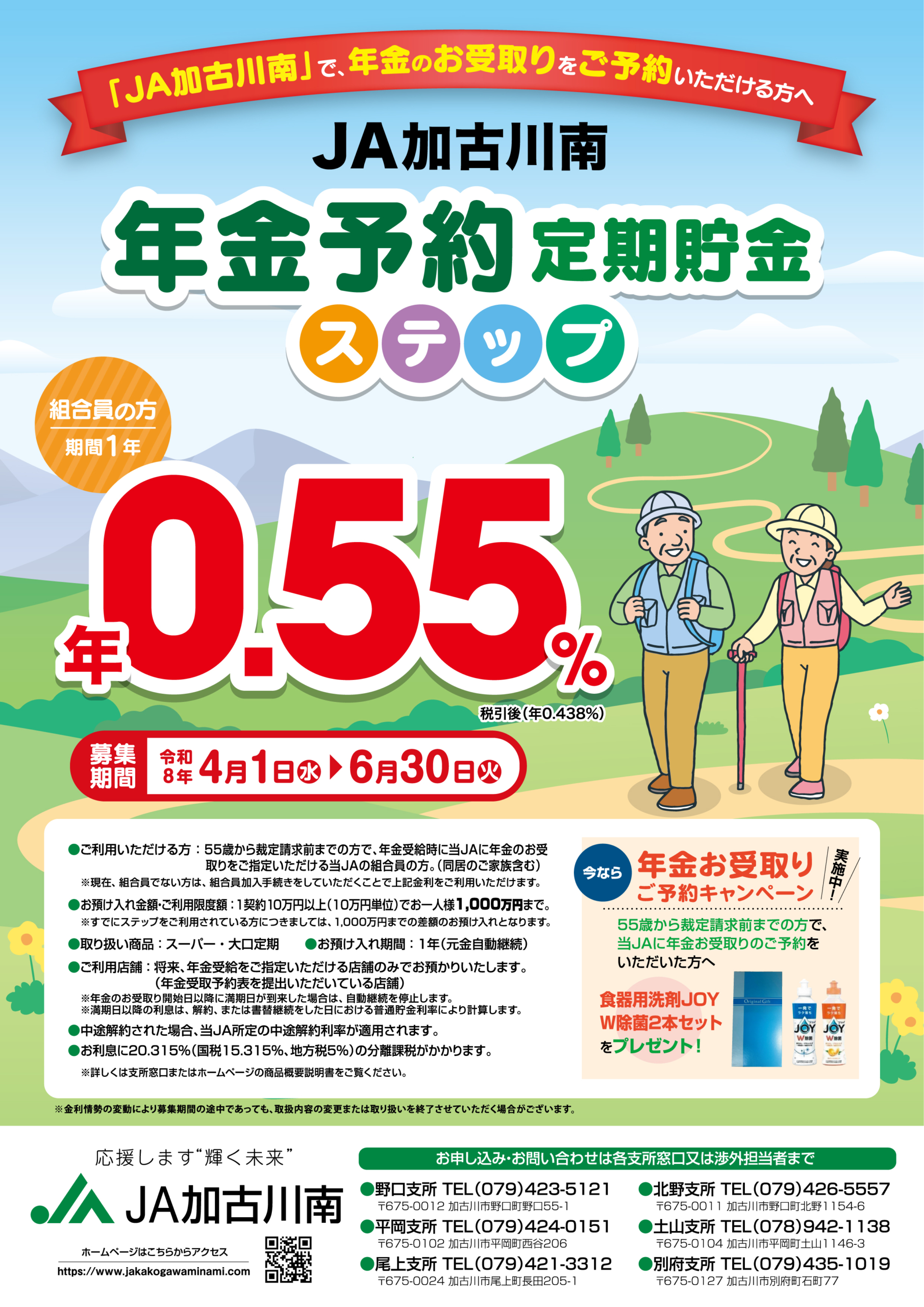55歳から64歳までの方で、JA加古川南で年金受取のご予約をいただいたお客様には「食器用洗剤JOY W除菌2本セット」をプレゼント!
