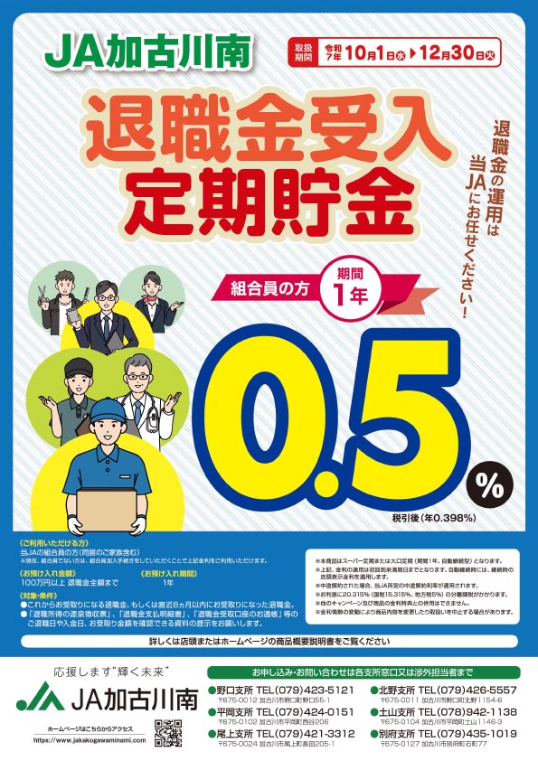 JA加古川南の組合員の方(同居のご家族を含む)が100万円以上から退職金全額まで1年のお預け入れ期間で年0.5%(税引後利率年0.398%)。
