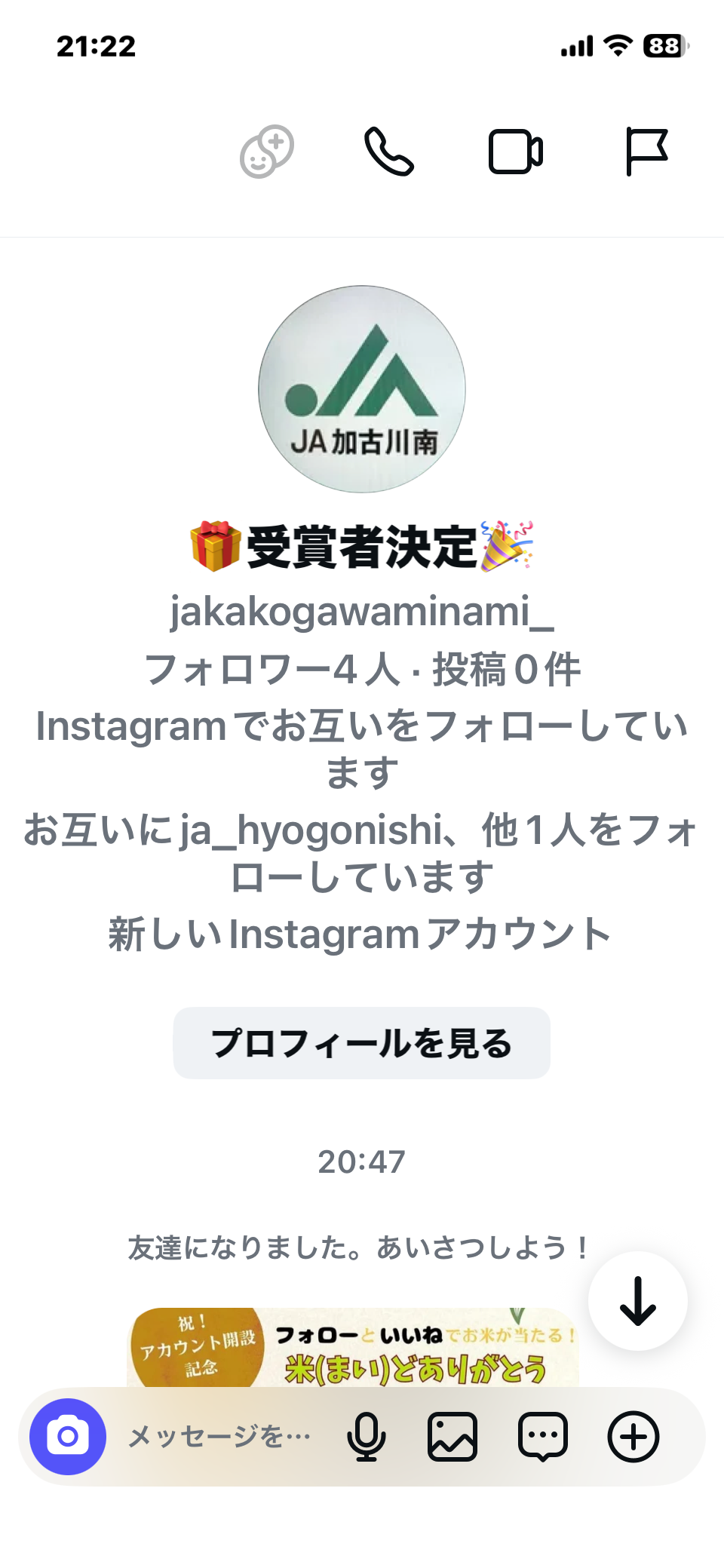 JA加古川南になりすました偽アカウントからキャンペーン当選のDM送信が確認されています。
